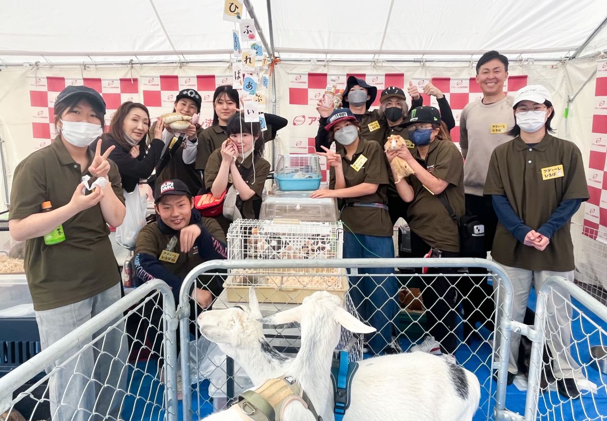 今回の出展は動物飼育技術学院が運営する「移動動物園カントリーファーム」の皆さまのご協力で実現しました。当日はサポートとして、同学院の学生ボランティアスタッフさんたちにも参加いただき、来場した子どもたちに動物の触り方やエサのあげ方を教えていただきました。