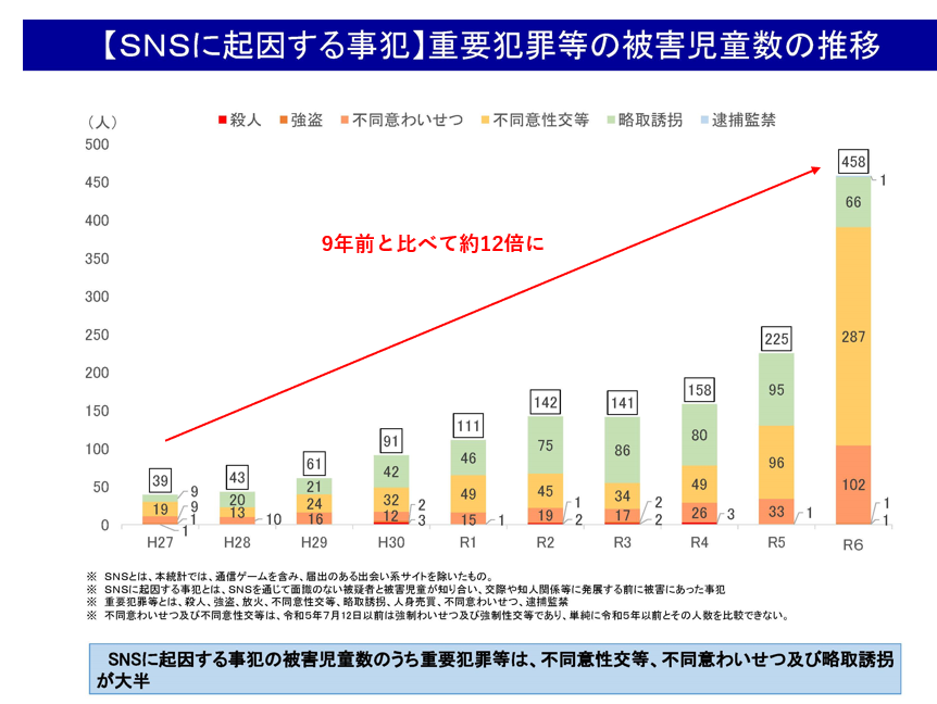 こうした取り組みの背景には、子どもたちを取り巻く環境の急激な変化があります。近年、子どもたちの生活環境はスマートフォンやSNSの普及により大きく変化し便利になった一方で、思いがけないトラブルに直面するケースが増加しています。特に、SNSに起因する青少年重要犯罪等の被害児童数は9年前に比べ約12倍増加しており、その他にもSNSを通じた誹謗中傷、いじめ、詐欺・消費トラブルなど、子どもたちを取り巻くリスクは複雑化しています 。