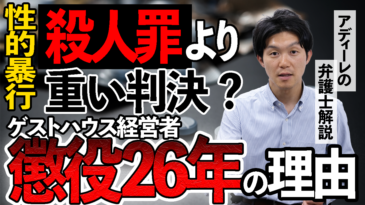 こちらをクリック!【懲役26年】性犯罪の罪は殺人罪より重い?ゲストハウスに宿泊した複数の女性に薬物を飲ませ、性的暴行をした罪などに問われた51歳の経営者に、懲役26年の実刑判決。この判決に対し、「殺人罪よりも重い判決」など、驚きの声も。このような重い判決が下された理由は?アディーレ法律事務所の宮内弁護士が解説します。