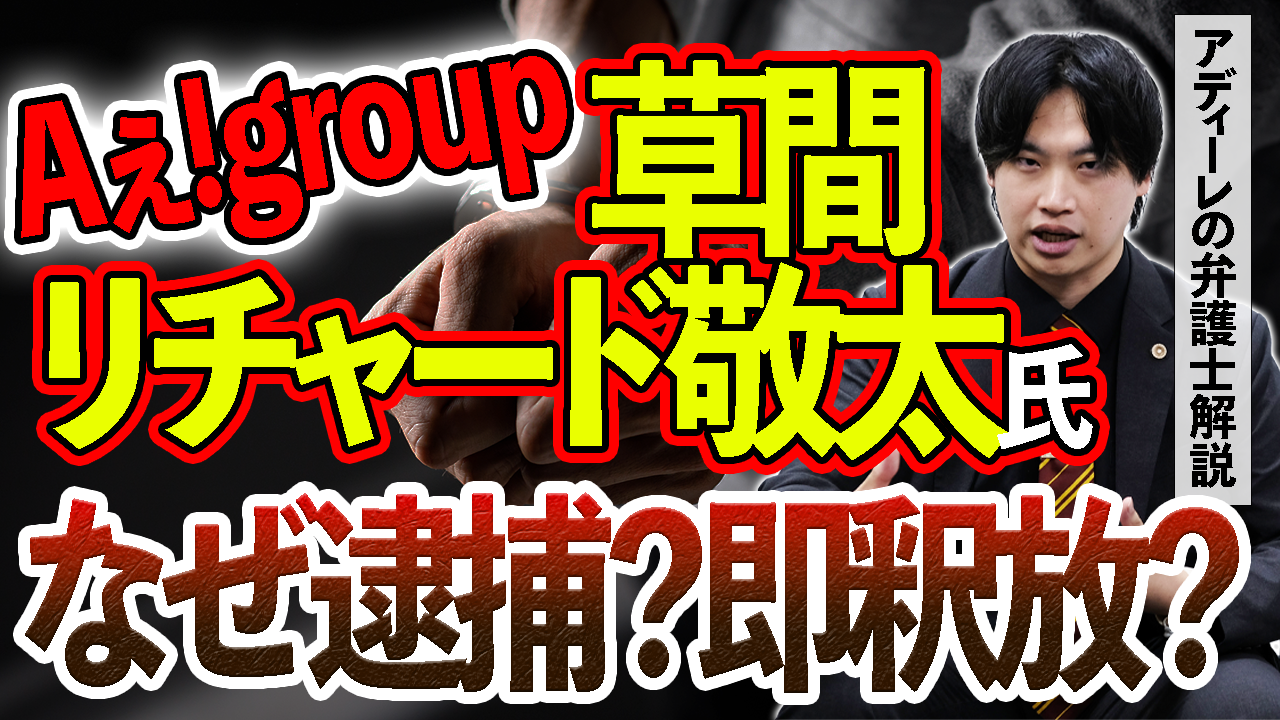 こちらをクリック!Aぇ! groupのメンバー・草間リチャード敬太さんが、2025年10月4日に公然わいせつ容疑で逮捕、2日後の10月6日に釈放されました。”隠し撮り”された現場映像として、真偽不明の動画がSNSに出回り、”ハメられた”という噂も。所属事務所のSTARTO ENTERTAINMENTが草間氏の活動休止を発表、さらに公式YouTubeの投稿を一時休止、関西の冠番組「Aぇ!!!!!!ゐこ」の放送休止など、様々な影響も広がっています。 逮捕された理由、2日後に釈放となった理由は?公然わいせつ罪の要件や逮捕後の流れも踏まえて、アディーレ法律事務所の吉田弁護士が解説します。